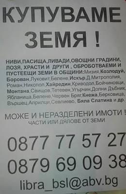 Купуваме земя / ниви,ливади,пасища,овощни градини,лозя и др. / на територията но области Враца,Монтана,Плевен, Велико Търново,Ловеч и Видин . Може и необработваеми / пустеещи / и или дялове /части / от неразделени наследствени имоти !