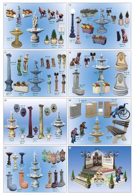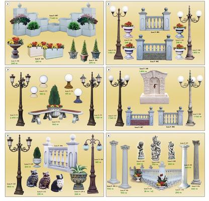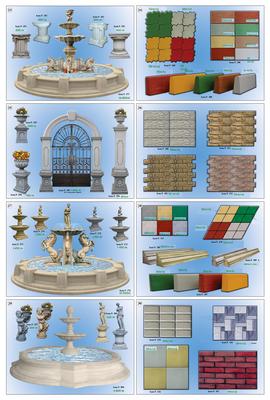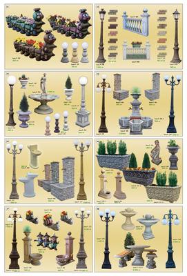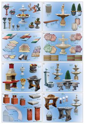 Предлагаме ви голямо разнообразие от декоративни бетонови изделия като фонтани , чешми , балюстради , барбекюта , кашпи , саксии , коминни тела , колони за входни врати , облицовки за фасада , плочници , улеи , осветителни тела и стълбове , различни фигури – слонче , козле , гъсеница , охлюв , орел , кон , лъв , котка , пума , магаре и други , различни статуетки , пейки градински с маса , всичко за басейна – оборудване – решетки , бордове , антипаркинг тела , градински комплекти .