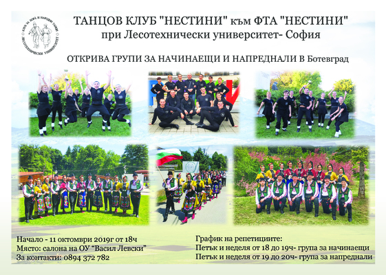 Танцов клуб "НЕСТИНИ" към ФТА "НЕСТИНИ" при Лесотехнически университет, София сформира групи за изучаване на български народни хора в Ботевград.