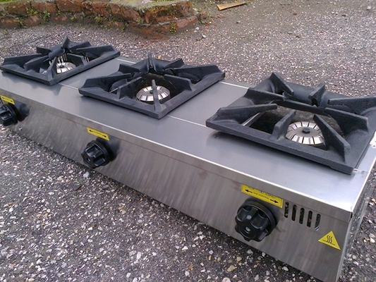 12./Газов котлон за заведения тройка професионален 3 х 7 = 21 KW производство Гърция със защита на газта височина 240мм.,широчина от ляво на дясно 1100мм.,дълбочина 600мм.,размер на отвора на горелката 180мм. котлона върви със комплект дюзи за метан, природна газ, и Пропан Бутан и със документ за съответствие за CE европейски съюз Цена – 1184лв.