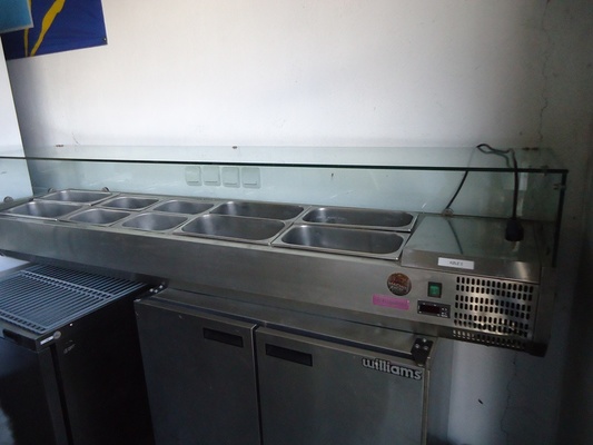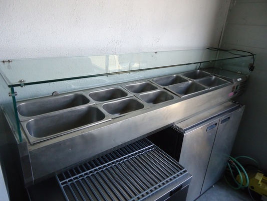 2.Витрина хладилна НОВА хоризонтална настолна за дюнер и бърза закуска за съхраняване на продукти и заготовки,като сосове,нарязани шумки и зеленчуци гастро норми 5 броя 1/4 външни размери височина 410мм.,широчина 1200мм., дълбочина 330мм., вътрешни размери височина 150мм., широчина 850мм., дълбочина 240мм., Цена – 950лв. за 7броя 1/4 външни размери височина 410мм., широчина 1700мм., дълбочина 330мм., вътрешни размери височина 150мм., широчина 850мм., дълбочина 240мм., Цена – 1150лв. ( една година гаранция )