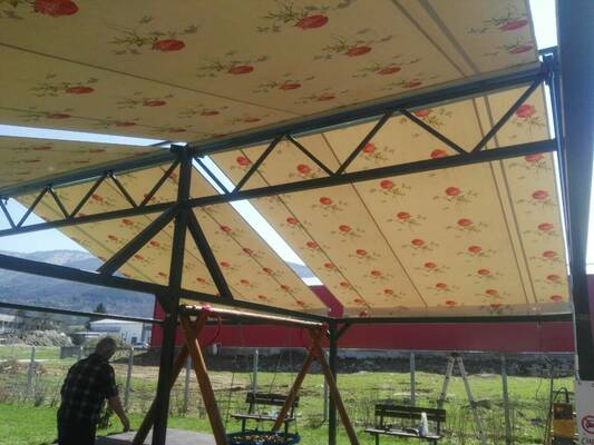 Фирма Тенти Антонис - Изработка и монтаж на тенти, сенници, ветроупорни завеси.Навеси с поликарбонат,метални конструкции,облицовка с дърво. Висококачествени материали,професионален монтаж и дългогодишен опит..
