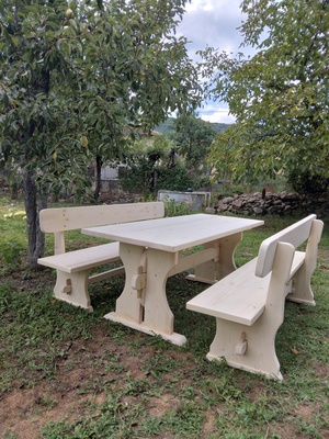 Плот на масата-890/2000,а седален плот на пейките е 395/1980. Използваното лепило за фуговане е клас Д-3. Импрегнация с "Бохемит"/за нова дървесина/
