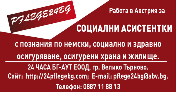 Жени на възраст между 30 и 60 години, с познания по немски за придружаване и гледане на възрастни и болни хора в Австрия, с предимство се ползват: лица, гледали възрастни хора, болни хора, домашни помощници, домакини, медицински сестри или подобно.