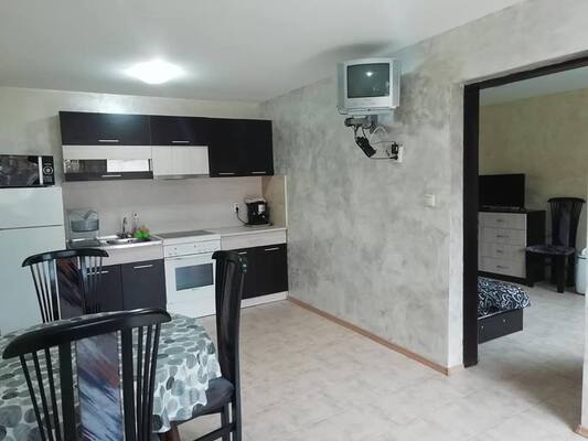 Състои се от три стаи/кухня, спалня, стая с две еденични легла/ и баня с тоалетна.