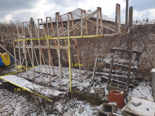 Размери, показани на снимката : дължина в основата: 2,80 м, дължина над кабината: 4 м., широчина: 1,80 м. , височина до кабината: 1,40 м.