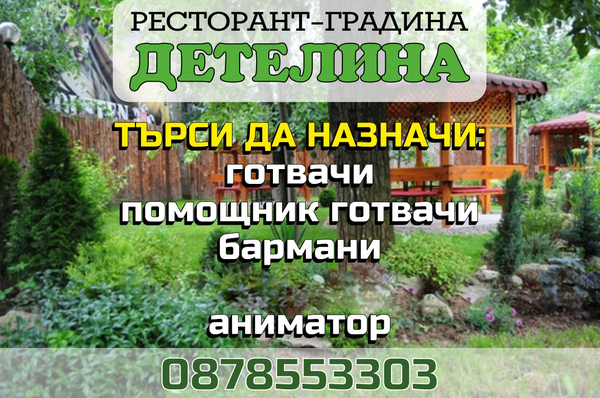Ресторант-градина „Детелина“ – Ботевград, обявява свободни работни места, за новия летен сезон 2022 г., за следните позиции: