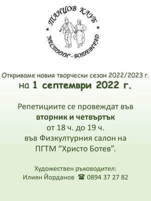 За любителите на български народни хора, групата за средно напреднали и напреднали репетира във вторник и четвъртък от 18ч. във физкултурния салон на Професионална гимназия по техника и мениджмънт "Христо Ботев", ул. Свобода №18.