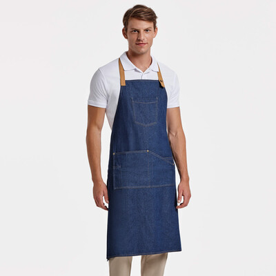 Дънкова престилка снабдена с 4 джоба и регулируема връзка за връта.