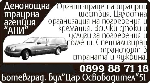 Денонощна траурна агенция Ани е на ваше разположение по всяко време на денонощието за община Ботевгрaд, Правец и Етрополе. Денонощна погребална агенция Ани предлага пълната гама от погребални услуги - организиране на погребения, организация на помени и кремации. Денонощна погребална агенция Ани предлага пълната гама от погребални артикули - ковчези, урни, погачи, некролози и др. Денонощна траурна агенция Ани осигурява безплатен ковчег. Денонощно погребално бюро Ани предлага специализиран транспорт на покойници в България и чужбина с луксозен автомобил (катафалка) на цени без конкуренция. Разполага и със собствена хладилна камера