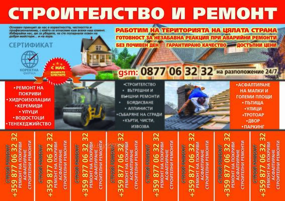 Строителство, Строителни Услуги, Строителни Ремонти, Майстори, Бригада, Фирма, Вътрешни Ремонти, Външни Ремонти, Офиси, София, Ихтиман, Владая, Вакарел, Ветрен, Пловдив, Стара Загора, Казанлък, Раднево, Мъглиж, Гълъбово, Бургас, Варна, Русе, Шумен, Велико Търново, Враца, Монтана, Плевен, Белене, Кнежа, Кърджали, Хасково, Добрич, Каварна, Шабла, Балчик, Търговище, Разград, Исперих, Силистра, Велинград, Пазарджик, Кюстендил, Перник, Бобов дол, Брезник, Трън, Тетевен, Троян, Рударци, Дупница, Радомир, Разлог, Банско, Симитли, Кресна, Струмяни, Ново Делчево, Крупник, Брежани, Сандански, Петрич, Гоце Делчев, Благоевград, Драгоман, Сливница, Сливен, Ловеч, Севлиево, Габрово, Трявна, Панагюрище, Стрелча, Перущица, Копривщица, Пещера, Смолян, Карлово, Калофер, Пирдоп, Златица, Ботевград, Етрополе, Своге, Банкя, Горна Баня, Долни Богров, Горни Богров, Нови Искър, Костинброд, Божурище, Елин Пелин, Лом, Монтана, Видин, Свиленград, Тополовград, Павликени, Харманли