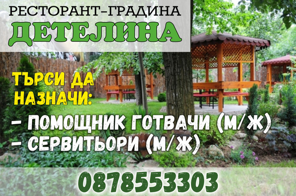 Ресторант-градина „Детелина“ – Ботевград, обявява свободни работни места, за летен сезон 2024 г., за следните позиции: