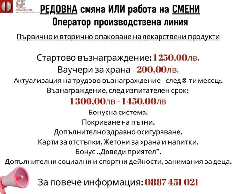 Възможност за РЕДОВНА смяна и работа НА СМЕНИ.