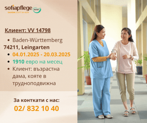 Повече информация можете да получите като посетите нашия сайт: https://sofiapflege.bg/listings/client-764cf456-21cb-4702-b70f-35dedfb6ee52/ или като се свържете с нас на тел. 02/ 832 10 40.