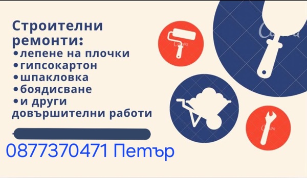 Извършваме всякакъв вид строителство. Хидроизолация на покриви демонтаж и монтаж на киримиден покрив смяна на улуци всякакъв вид вътрешно шпакловки мазилки боядисване Ел услуги водопровод тел за връзка 0877370471
