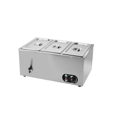 Професионалното електрическо бен мари с мощност 1.5 kW е надеждно решение за ресторанти, хотели, кетъринг и бюфети. Работи на принципа на водна баня, което осигурява равномерно нагряване и предпазва храната от изсушаване и загаряне. Подходящо е за супи, сосове, гарнитури и готови ястия. Регулируемият термостат с диапазон 20°C – 85°C гарантира прецизен контрол и постоянно качество при сервиране. Компактният настолен дизайн го прави идеално за линии за обслужване и самообслужващи зони.