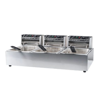 Професионален фритюрник с три вани 6 л е решение за кухни, които трябва да пържат различни продукти едновременно без смесване на вкусове и без спад в температурата. Подходящ е за ресторанти, заведения за бързо хранене, хотели и кетъринг кухни със средно до високо натоварване. Трите независими вани позволяват паралелна работа и постоянен контрол върху процеса, което ускорява обслужването в пикови часове. Корпусът от неръждаема стомана и отделните нагреватели осигуряват надеждност, стабилност и лесна поддръжка при ежедневна употреба.