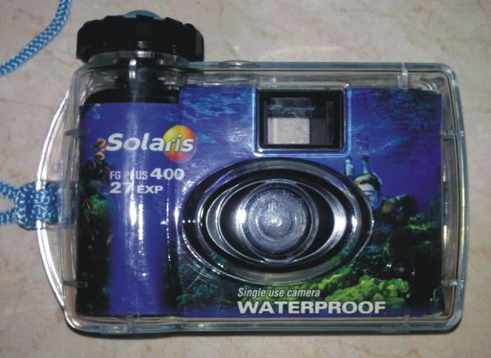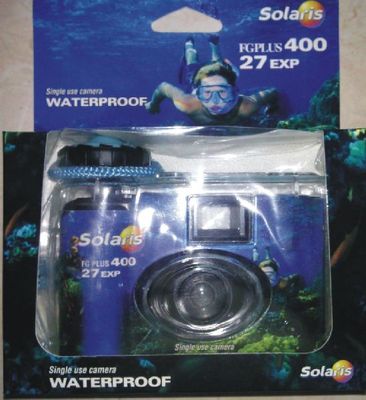 Фотоапарат за еднократна употреба Ferrania SOLARIS подходящ за употреба под вода – до 10 м дълбочина, но също и на плажа и в снега, производство на Ferrania SA – Италия.