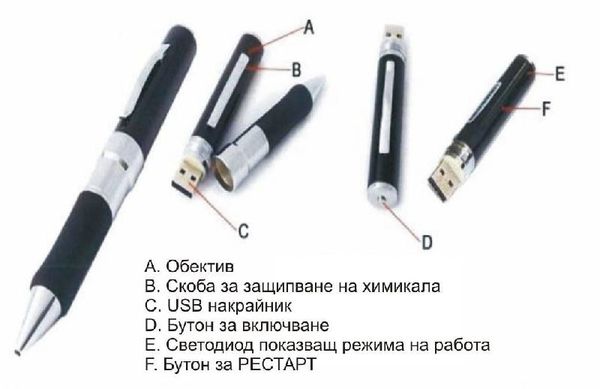 Настоящият продукт представлява химикал с вградена миниатюрна камера с автофокус, записваща в AVI формат и вградена флаш памет 4 GB; размери 150мм дължина, 14мм ширина и 30гр тегло.
