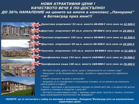 ДО 36% НАМАЛЕНИЕ на цените на имоти в комплекс „Панорама“ в Ботевград през юни!!!