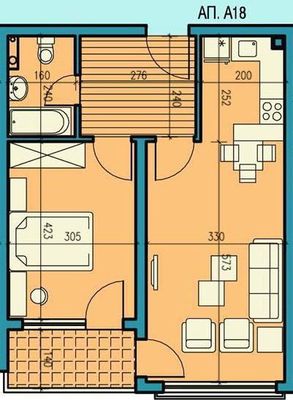 Апартамент А18 е разположен във секция "А" на пети етаж . Състои от входно антре, просторна дневна стая с кухненски бокс, голяма спалня и баня с тоалетна. И двете стаи излизат на обща тераса. Изложение изток с чудесна гледка към озеленения парк на комплекса.