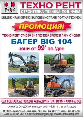 * Обяванета цена е за наем за 1 ден без гориво и без оператор, без ДДС.