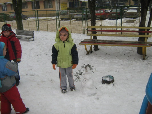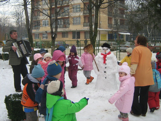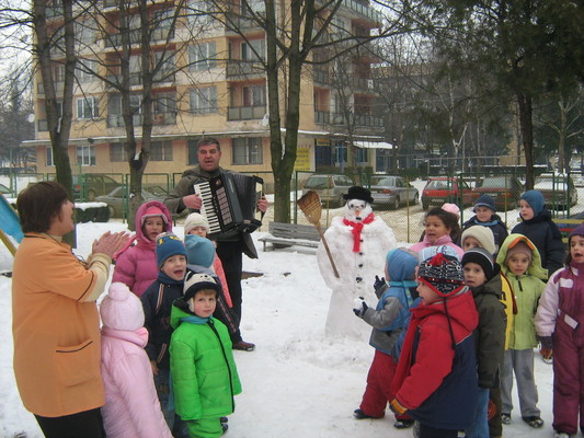 По-топлото време преди обяд стана повод деца от трета група на ЦДГ “Слънце” да поиграят в снега и да направят снежен човек в двора на детската градина. Разбира се, пръв помощник на малчуганите бе тяхната учителка Димитрова. След като снежният човек бе напълно готов, децата се хванаха на хоро и изпяха няколко песни, посветени на зимата и веселите игри. Изпълненията им бяха в съпровод на акордеон от учителя по музика Бойко Тодоров.