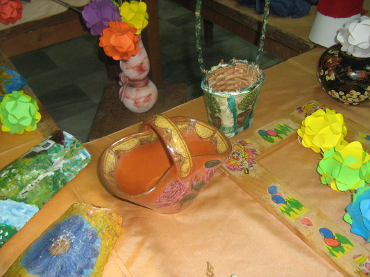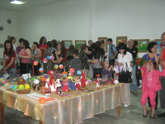 Учениците от СИП по рисуване показват голямо разнообразие от ръчно изработени експонати – рисунки върху стари керемиди, глинени съдове и плетени кошници, кукли, цветя и други.