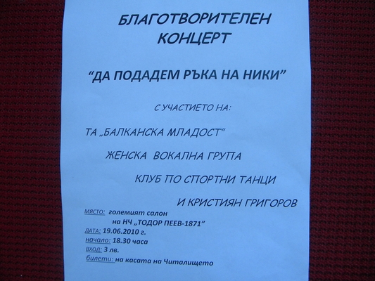 Сумата от 600 лева на месец не е по силите на семейството му, поради което НЧ „Тодор Пеев 1871” Етрополе организира на 19 юни т.г. от 18:30 ч. в големия салон благотворителен концерт „Да подадем ръка на Ники”.