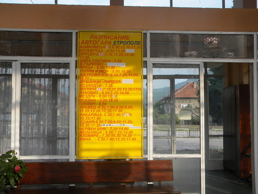 В чакалнята има указателно табло-разписание за пристигащите и отпътуващи автобуси.
