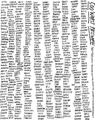Авторът на книгата "Perfect Password Selection and Protection" e създал този забавен плакат, където могат да се видят 500-те най-често срещани пароли при обикновените потребители.