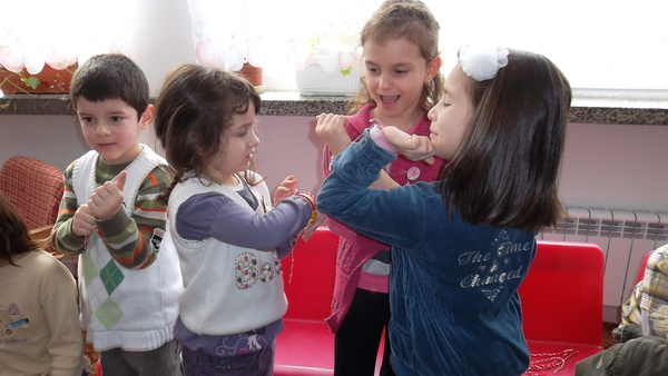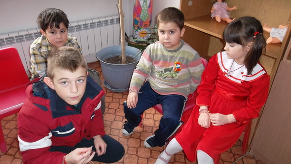 Така в тази първомартенска утрин учениците от III ”а” клас при ОУ”Христо Ботев”-гр.Етрополе бяха топло посрещнати от г-жа Бояджиева и г-жа Цв.Маринова, за да честитят празника 1 март на децата и колектива в ДГ „Сашка”.