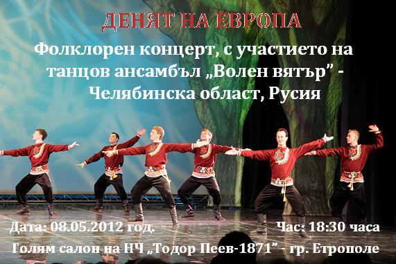 За Деня на Европа в Етрополе ще има Фолклорен концерт с участието на руския ансамбъл от Челябинска област “Волен вятър”.