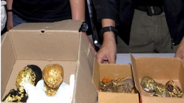 Шест човешки ембриона, покрити със злато, откриха в багажа на 28-годишен англичанин. Младият мъж от азиатски произход пътувал от Тайланд за Англия. На митницата в Банкок обаче го заподозрели и го накарали да си отвори куфара. Митничарите направо ахнали при вида на ембрионите, опаковани като подаръци в куфара на младежа, пише "Билд".