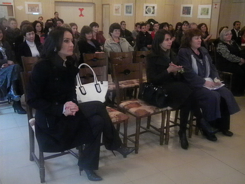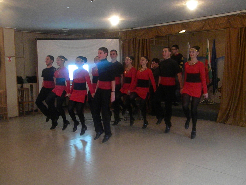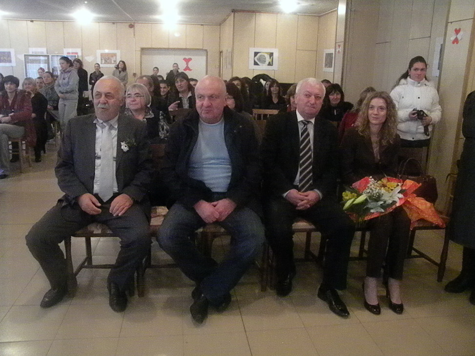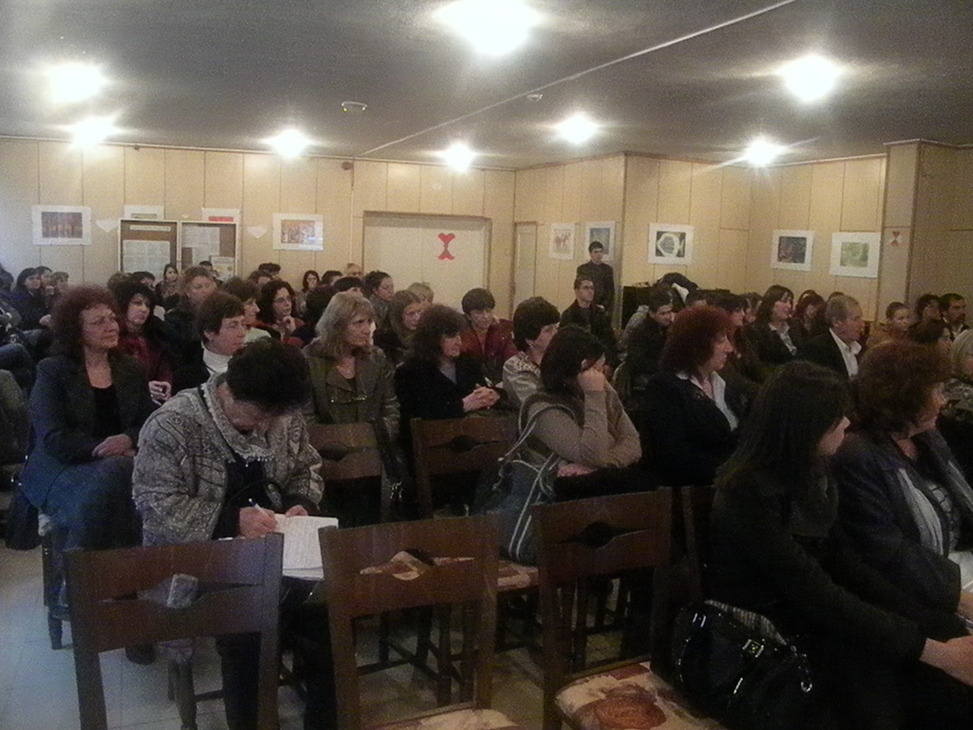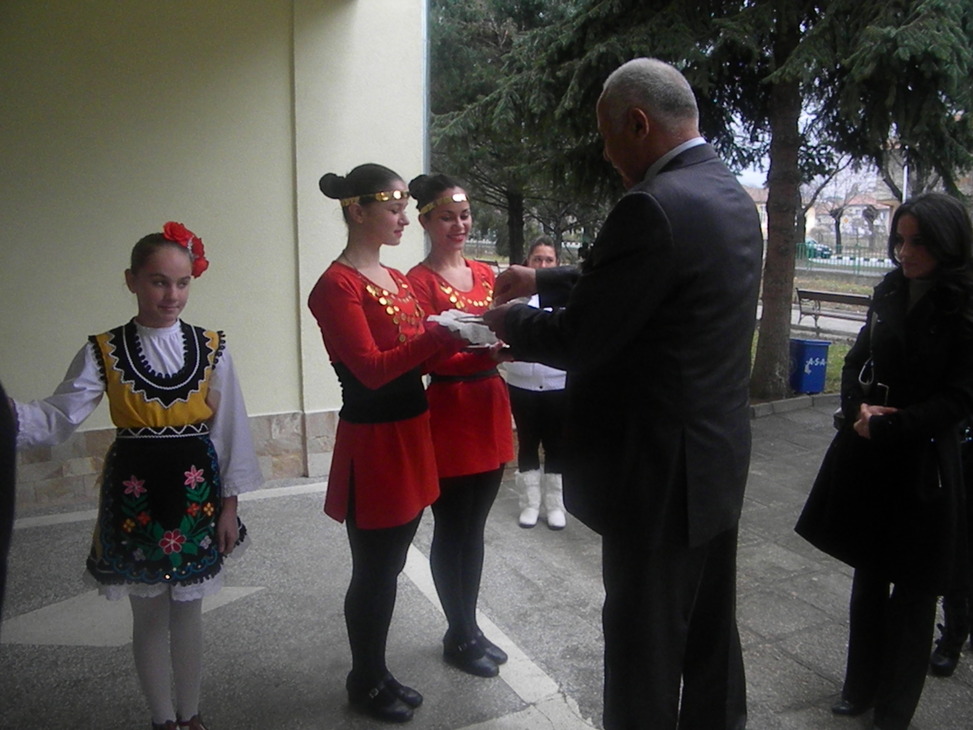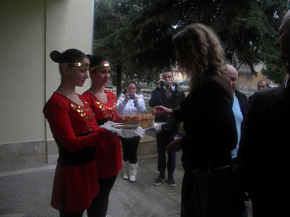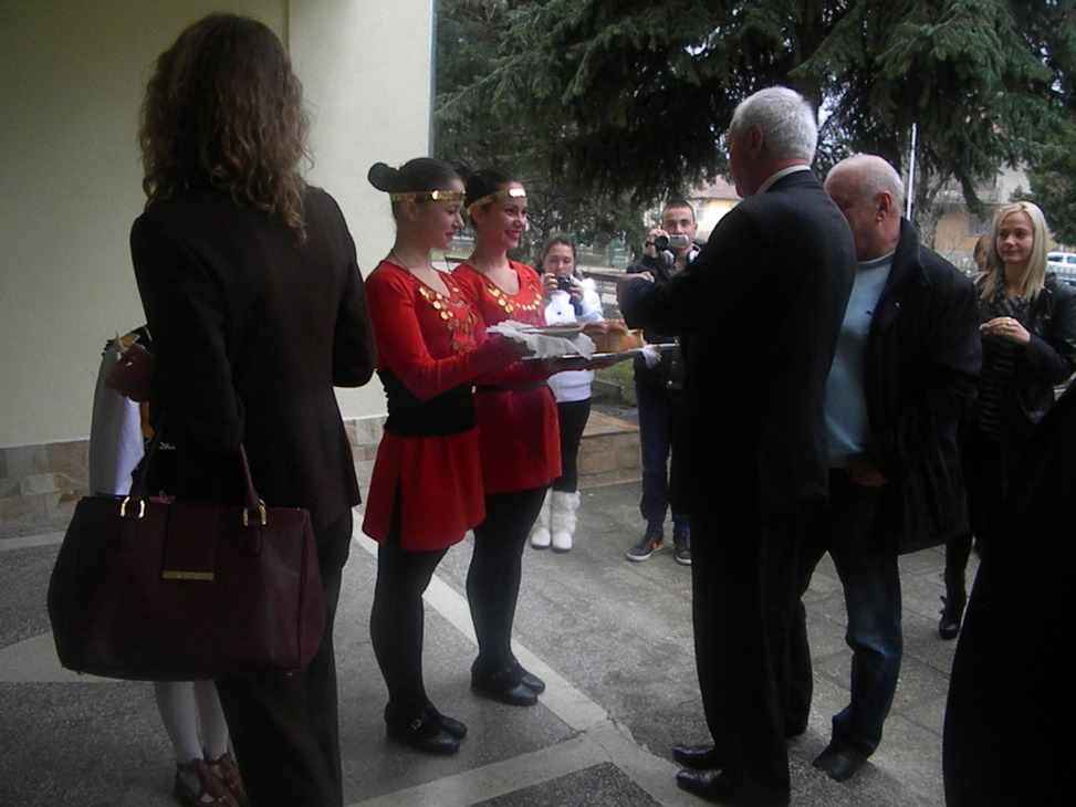 Срещата с учители и ученици започна от 12:30 часа в Актовата зала на гимназията. Групата дойде след посещение в трите целодневни градини и беше приятно изненадана с българско хоро, изпълнено от ученици-танцьори в Ансамбъл “Балканска младост” с ръководител Калинка Пушкарова.