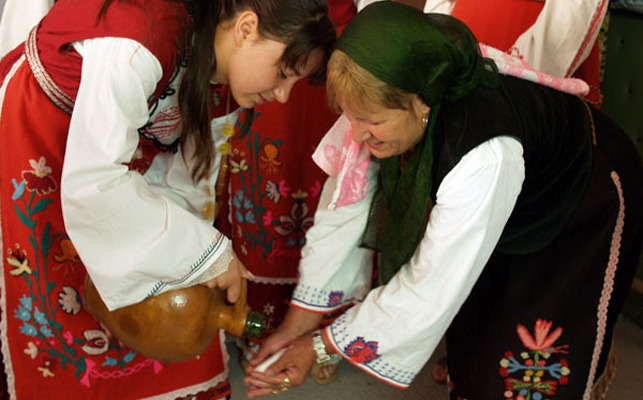 Рано сутринта при бабата-акушерка идват жени, чиито деца са на възраст от 1 до 3 години. Там в двора, под овощни дървета се извършвал ритуалът "измиване на ръцете". Млади жени, които донасяха със себе си от дома една кофа с чиста вода, сапун и нова кърпа и поливат водата на "акушерката" да си измие ръцете. След това подават кърпата, която тя приема като подарък (още като подаръци на акушерката донасят облекло, текстил - всичко това оставят на дясното й рамо). При този ритуал старата жена пожелава на детето да е живо и здраво, като го напръсква с вода.