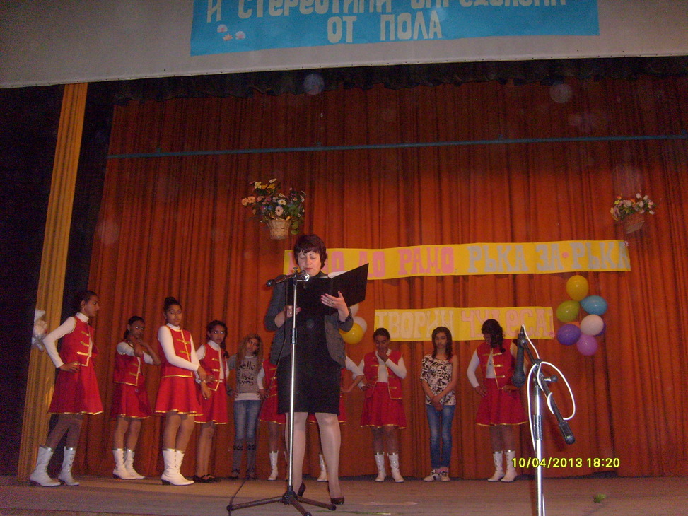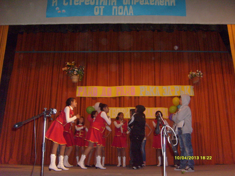 Общо 49 ученици /4-8 клас/ от ОУ „Васил Левски” взеха участие в спектакъла „На мегдана”, който представлява една впечатляваща смесица от стихове, песни, танци и сценки за приятелството, за равнопоставеността между половете в училище, в семейството и на професионалното поприще. Сериозната тема бе разработена по атрактивен и достъпен начин за всички ученици.