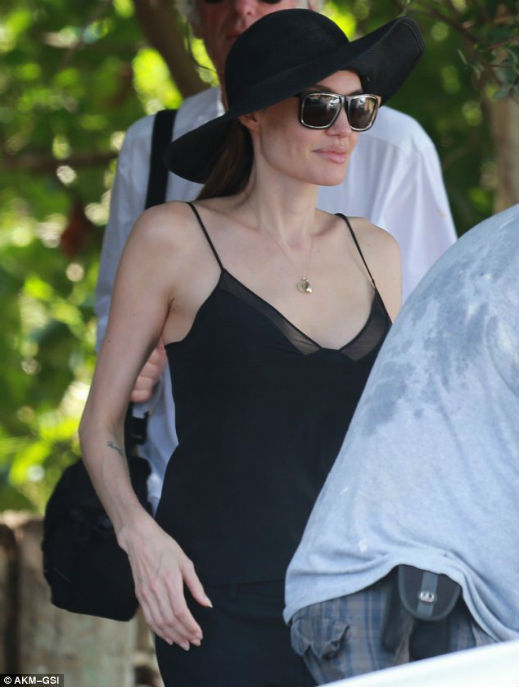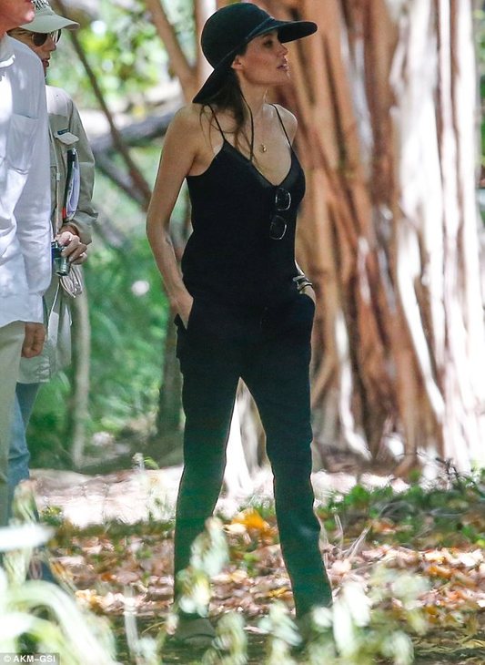 Брюнетката е в Хавай, изглежда прекрасно и по всичко личи, че не е изгубила духа си и чаровната си усмивка. Джоли е облечена с тънка прозрачна блуза с дълбоко деколте, слънчеви очила и шапка с голяма периферия.