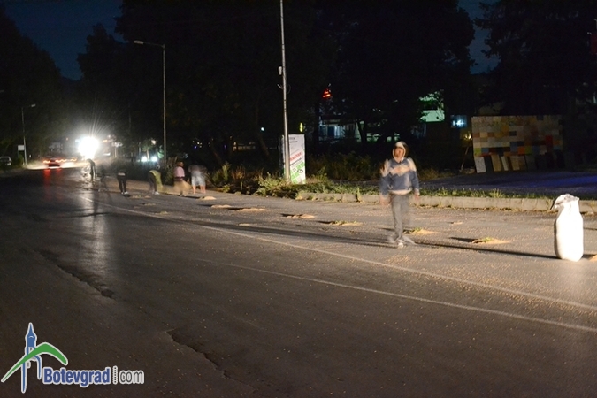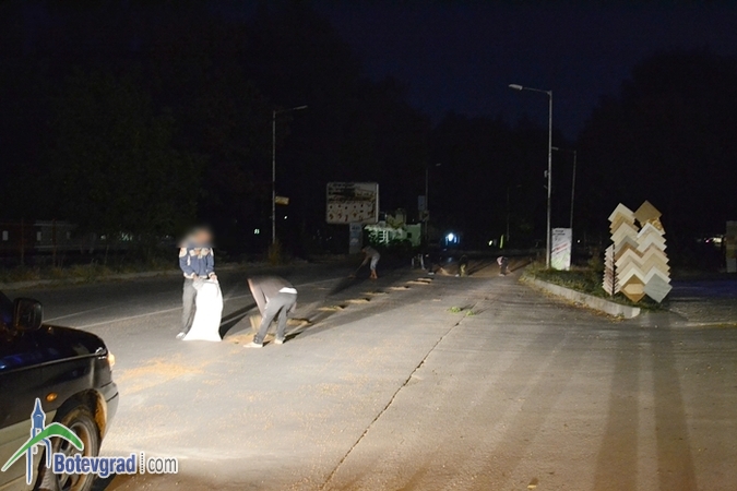 От бензиностанцията на „Газтрейд” на булевард „Цар Освободител” до местността Малините пътното платно е засипано от голямо количество жито. Движението в този участък е затруднено. На място има полиция, а група работници са започнали да метат житото и да почистват пътното платно.