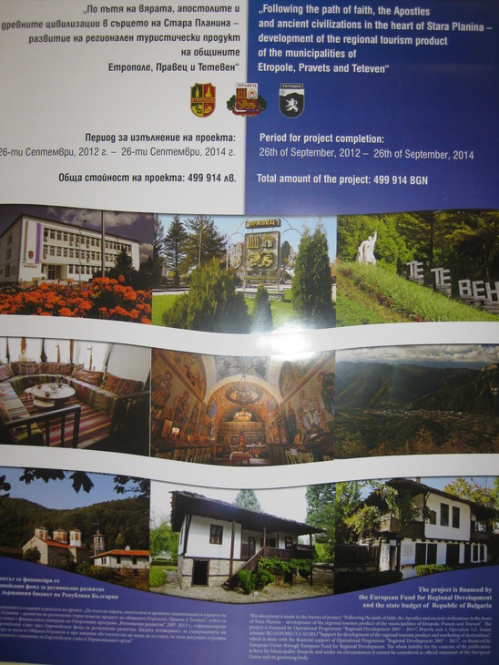 „Тази публикация е направена в рамките на проект: „По пътя на вярата, апостолите и древните цивилизации в сърцето на Стара Планина – развитие на регионален туристически продукт на общините Етрополе, Правец и Тетевен”, който се осъществява с финансовата подкрепа на Оперативна програма „Регионално развитие” 2007-2013 г., съфинансирана от Европейския съюз чрез Европейския фонд за регионално развитие. Цялата отговорност за съдържанието на договора се носи от Община Етрополе и при никакви обстоятелства не може да се счита, че този документ отразява официалното становище на Европейския съюз и Управляващия орган.”