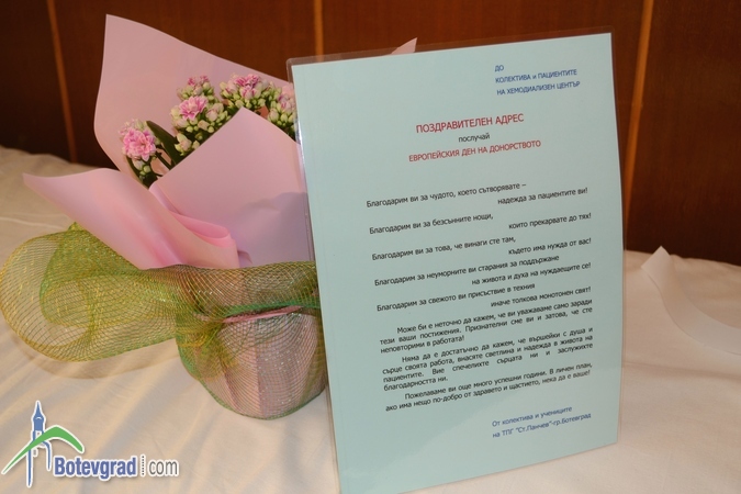 След училищните прояви фелдшер Ели Табакова и група ученици посетиха Центъра по хемодиализа в МБАЛ – Ботевград. От името на цялото училище те поднесоха на работещите в отделението поздравителен адрес и цвете в саксия, а на всички болни – по китка здравец.