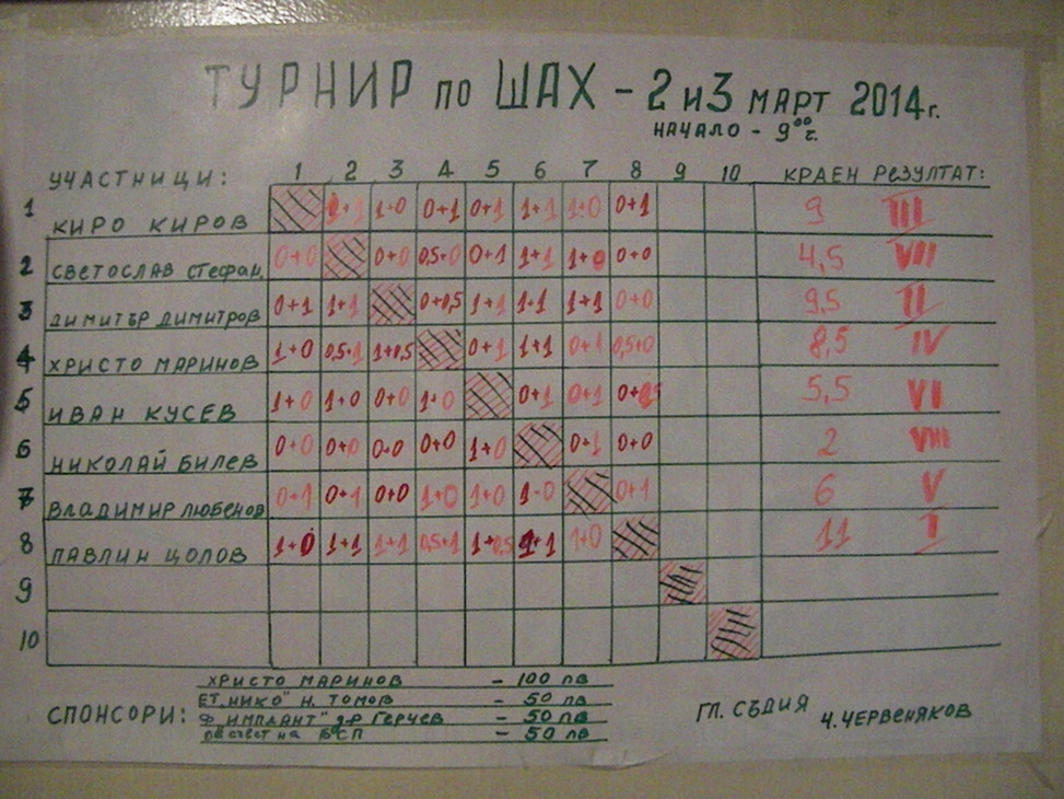 Победителите: 1. Павлин Цолов с 11 точки, 2. Димитър Димитров – 9,5 точки и 3. Киро Киров с 9 точки.