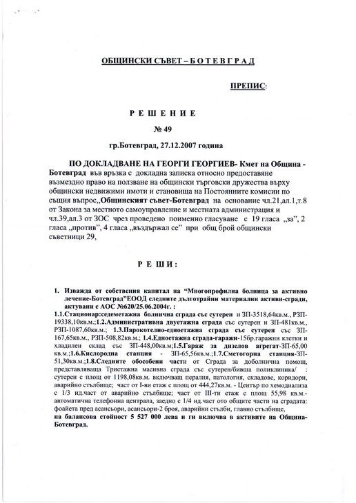 - Сградата, обект на извършената проверка, е извадена от капитала на търговското дружество „МБАЛ Ботевград“ ЕООД и е върната в активите на Община Ботевград, с решение №49 на Общински съвет Ботевград от 27.12.2007 г., след което е издаден акт за частна общинска собственост №986/18.01.2008 г.
