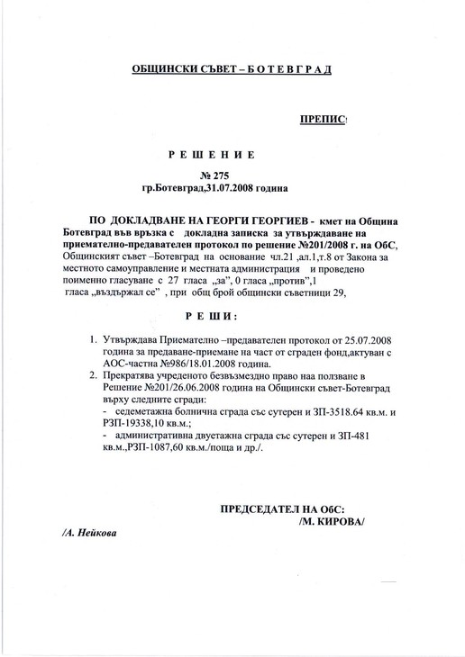 - С решение №275 от 31.07.2008 г. На ОбС Ботевград, се утвърждава приемателно-предавателен протокол от 25.07.2008 г. , с който "МБАЛ Ботевград" предава, а Община Ботевград приема част от сграден фонд, актуван с АОС №986/18.01.2008, включващ седеметажната болнична сграда. Точка втора от същото решение прекратява безвъзмездното право на ползване на този обект, учредено на „МБАЛ Ботевград“ само месец по-рано.