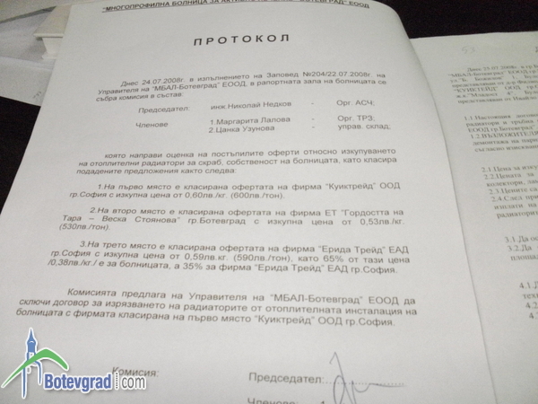 Вземайки предвид гореописаните обстоятелства, силно недоумение буди фактът, че на същата дата – 25.07.2008г. , управителят на болницата сключва договор с фирма, на която продава и възлага демонтирането на отоплителната инсталация на същата тази седеметажна сграда, въпреки че имуществото, с което на практика се разпорежда към онзи момент, вече от половин година не е в активите на управляваното от него търговско дружество. Подписаните от него на 25.07.2008-ма официални документи имат доста противоречив характер. От една страна МБАЛ продава отоплителната инсталация за скрап, а от друга - връща я на Община Ботевград, предавайки активите на седеметажната сграда с протокол !?!