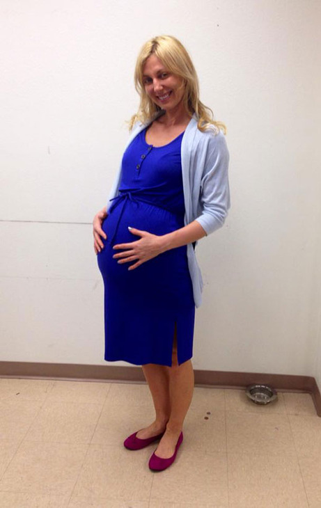 Облечена в синя рокля, тя се пъчи като горда бъдеща мама, която скоро ще ражда. "Наистина ли си бременна?", започнаха да я питат приятелите й, изумени от неочакваната новина.
