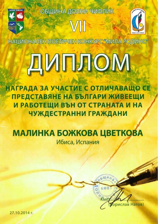 Ботевградчанката Малинка Цветкова е сред лауреатите на седмото издание на националния поетичен конкурс „Мила Родино”, организиран от Съюз на българските писатели, Съюз на независимите писатели в България, Издателска къща „Компас” – Варна, Издателско-полиграфичен комплекс „Абагар” – Велико Търново, списание „Простори” – Варна, Музикална компания „Сънрайз Маринов” – Варна. Отличени бяха стихотворенията й „Господ ни обича”, „Моята болка”, „На Стамен Панчев с признателност” и „Защо”.