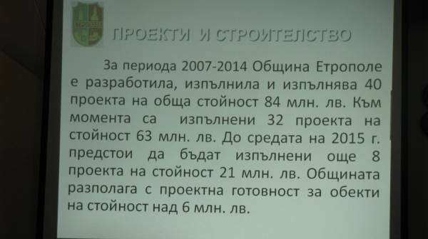 В презентацията бяха включени реализираните проекти за периода 2007-2014. За този период са изпълнени и продължават да се изпълняват 40 проекта. Общата им стойност е 84 млн. лв. Завършени са 32 проекта - на стойност 63 млн. лв. До средата на 2015 г. предстои да бъдат изпълнени още 8 проекта на стойност 21 млн. лв.