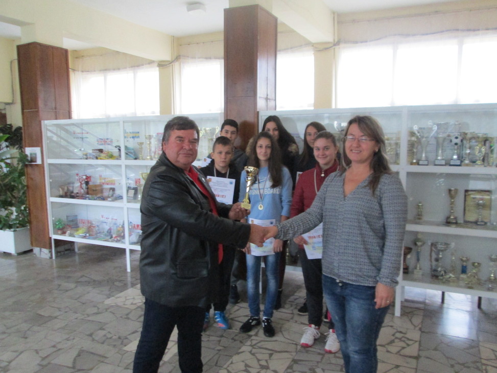 Купата бе връчена официално на заместник-директора на СОУ,,Христо Ясенов" Росица Василева.