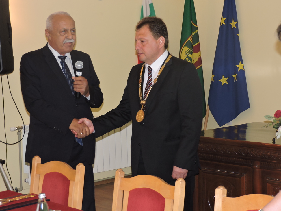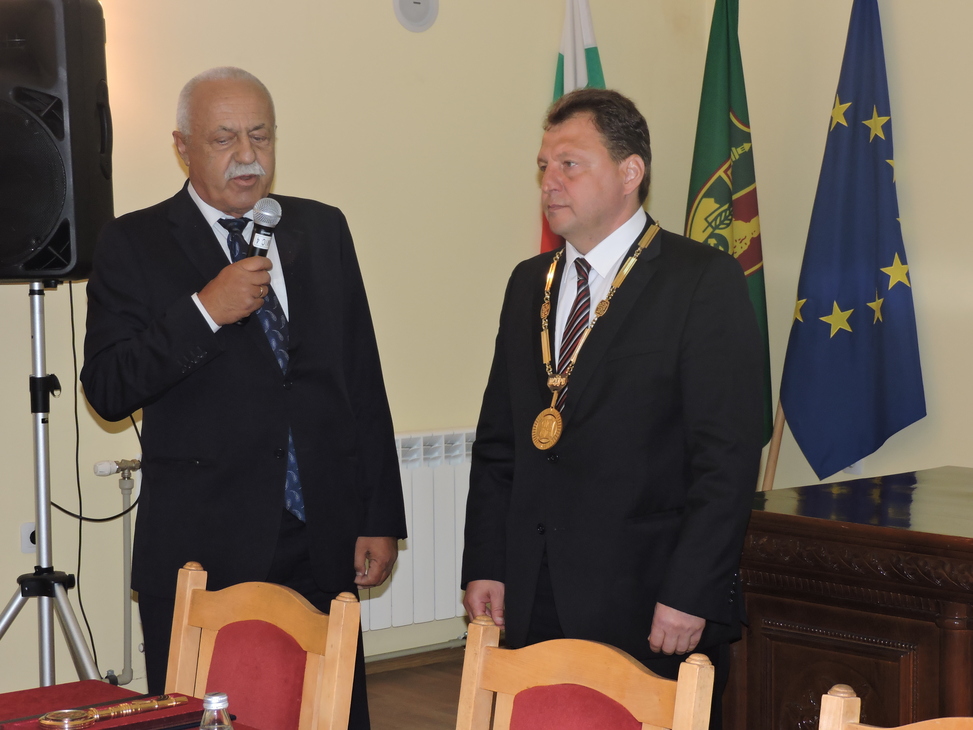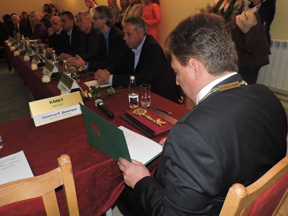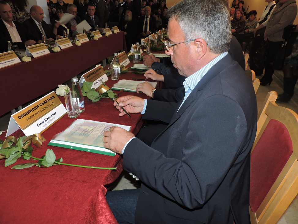 Пръв положи клетва и подписа клетвения лист новият кмет Димитър Радославов Димитров, след което получи от досегашния кмет инж. Богомил Георгиев символите на властта: огърлица и символичния ключ на град Етрополе. Като полковник от резерва инж. Богомил Георгиев получи високо отличие от името на командването на Българската армия.